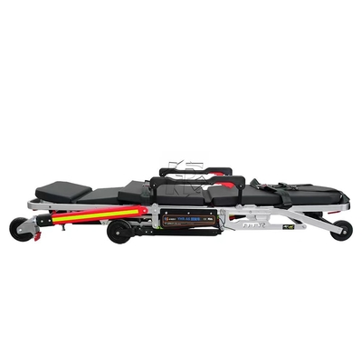 This stretcher trolley, mainly with an aluminum alloy body and die-cast aluminum alloy fittings, is lightweight, tough, easy to disinfect, suitable for hospital emergency centers to transfer the wounded. It has PVC sponge cushions (waterproof, fireproof, anti-corrosive), a backrest adjustable up to 75°, folding leg structure (controlled by right-hand handle), polyethylene plastic armrests and rubber-edged durable wheels. It must be locked with ambulance fixtures after boarding. Equipped with two safety straps, it can fold into a chair with 5-level angle adjustment, ideal for transferring patients in limited spaces like hospital elevators, ambulances, airplanes and urban road ambulances.